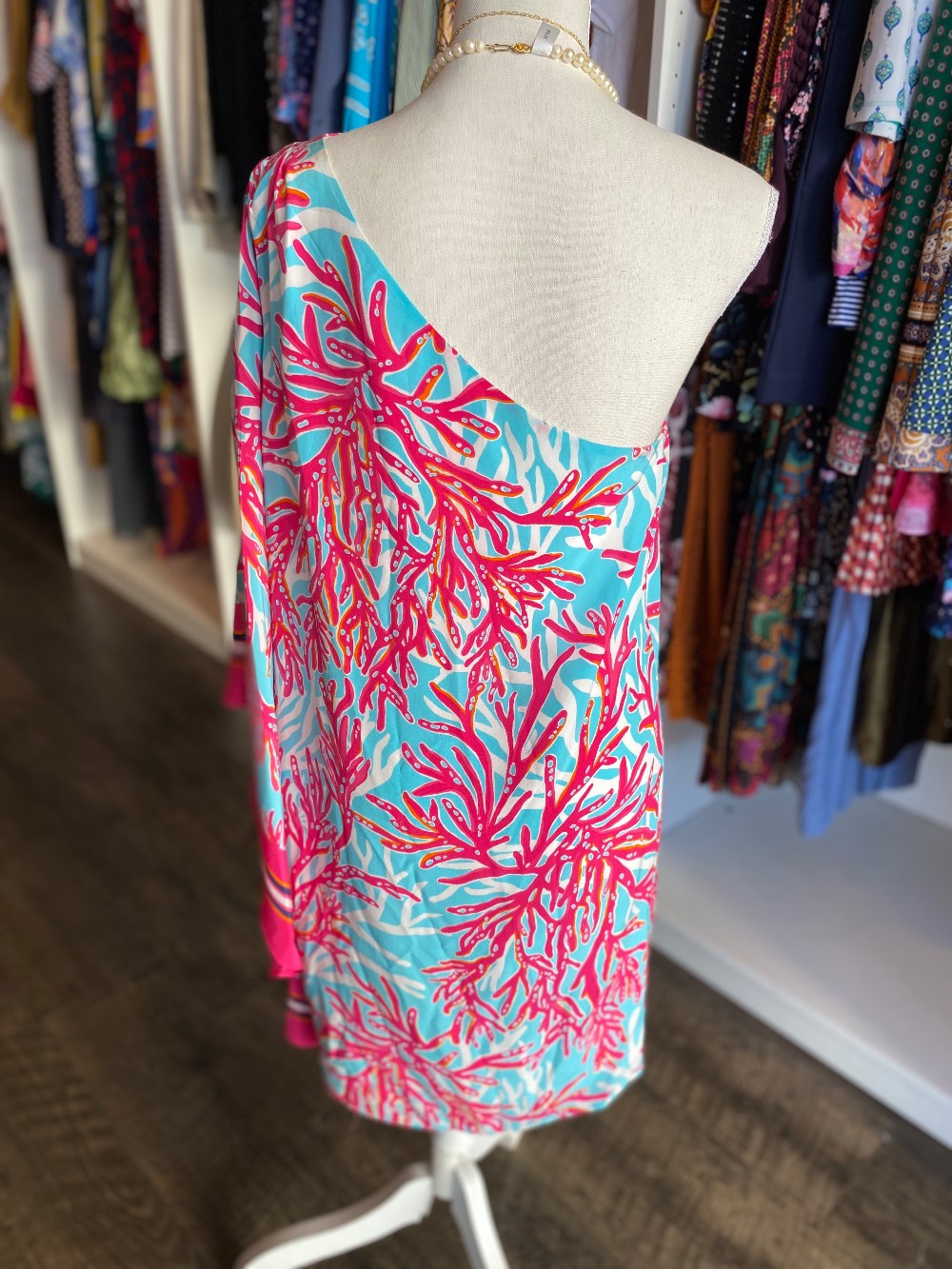 Gorgeous silk Lilly one shoulder dressNo flaws100% Silk shell with polyester lining