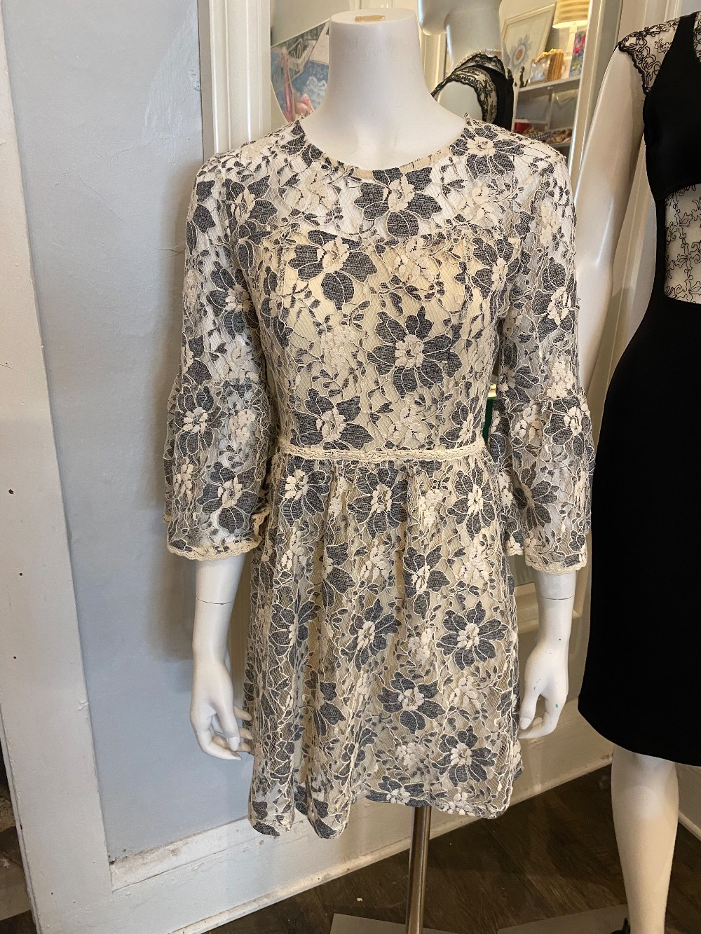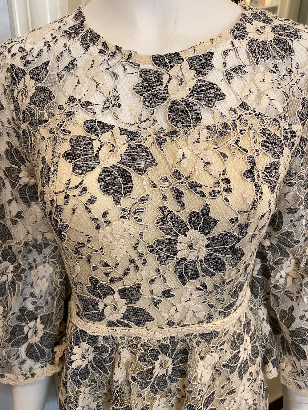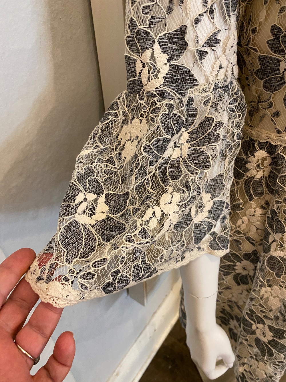 white lace with navy blue floral design