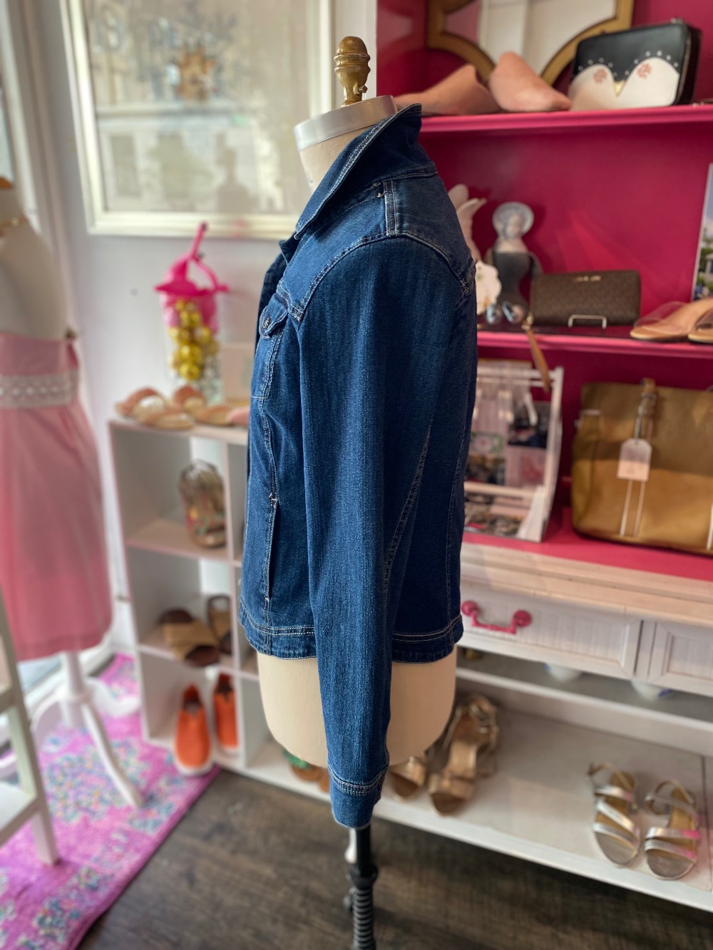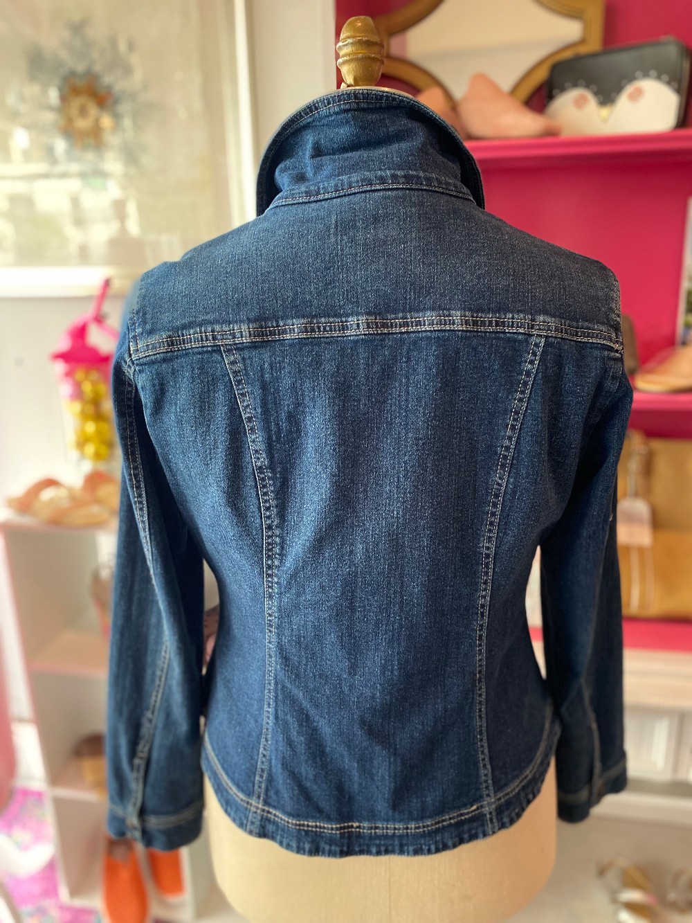 Soft denim jacket, in very good preloved conditionmade of cotton and spandexsnap buttons down the front