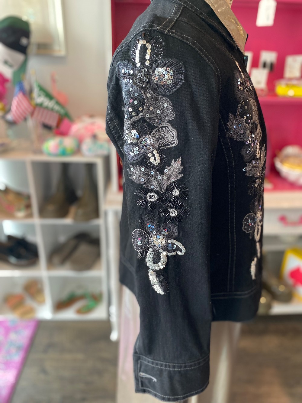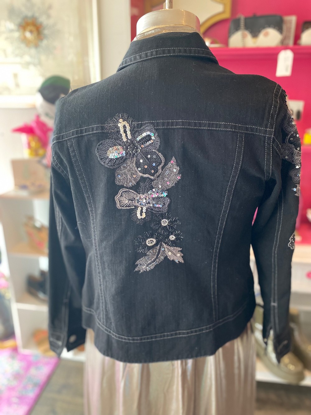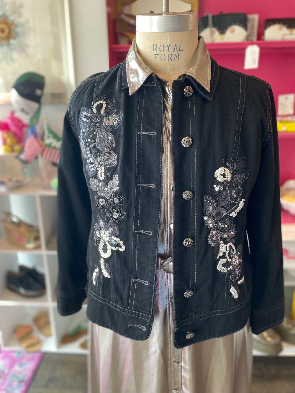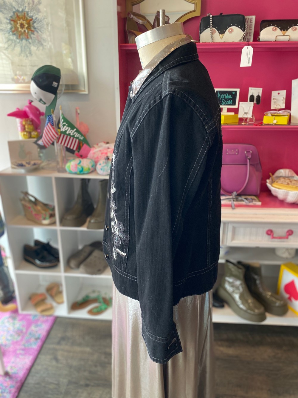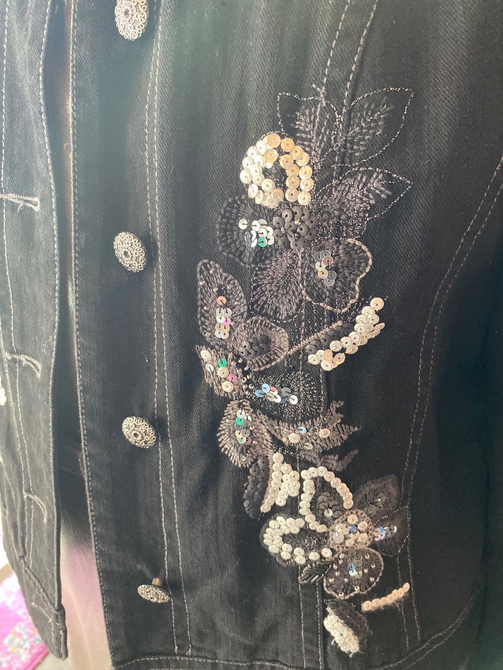 In very good preloved conditiondark denim with tons of sequins and beadsslight stretch, and it's fully lined on the inside