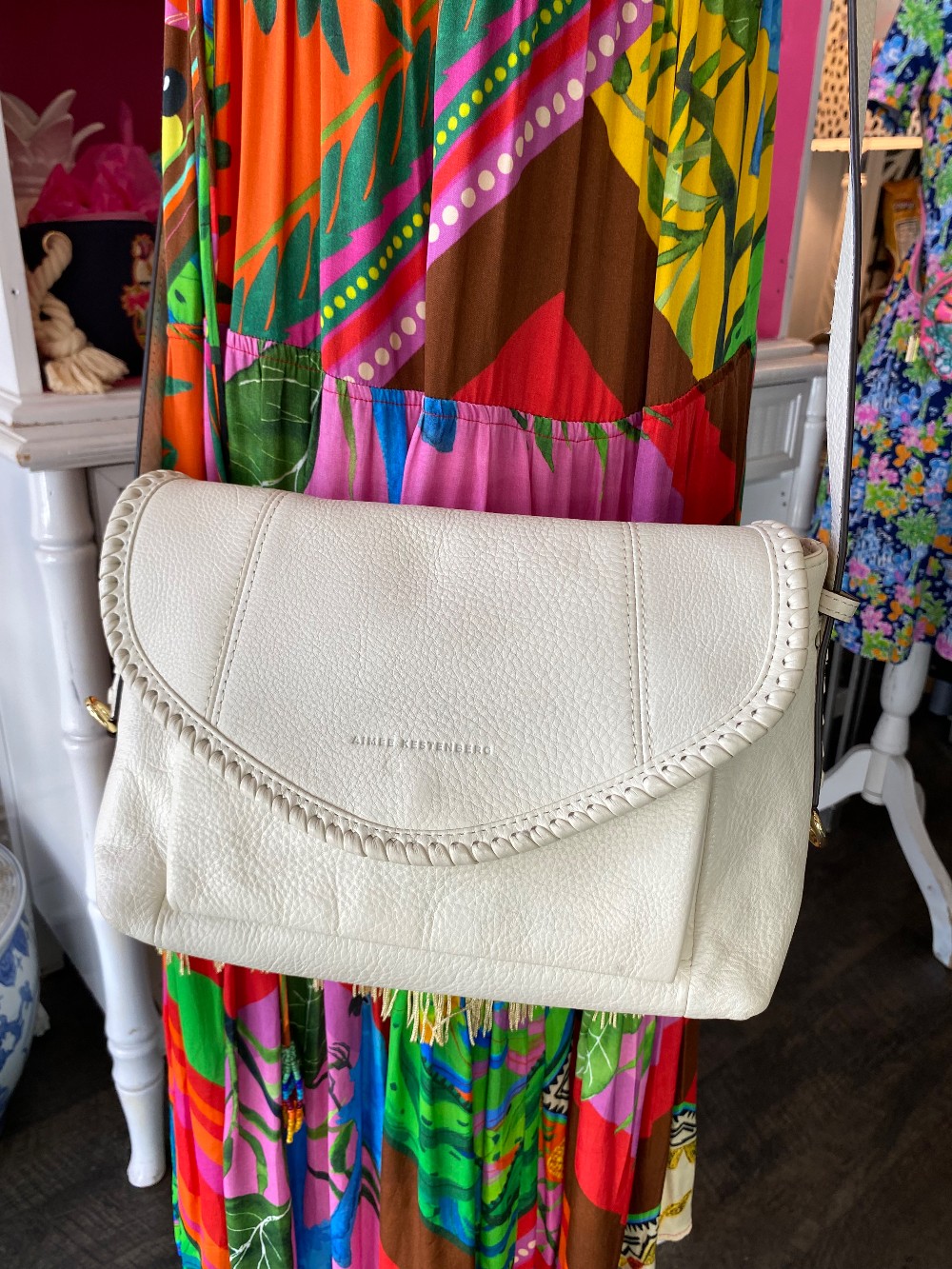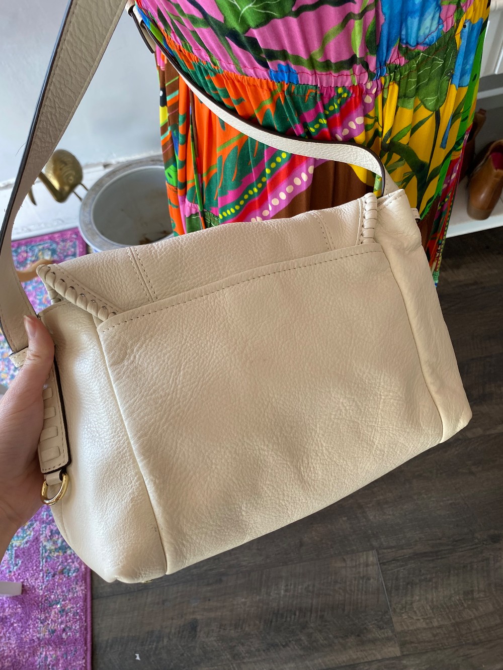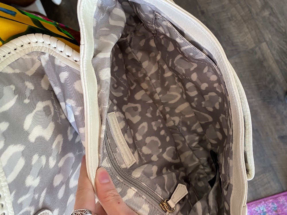 In good preloved conditionwhite pebbled leatherflap over magnetic closureadjustable strapone small spot on the front flap