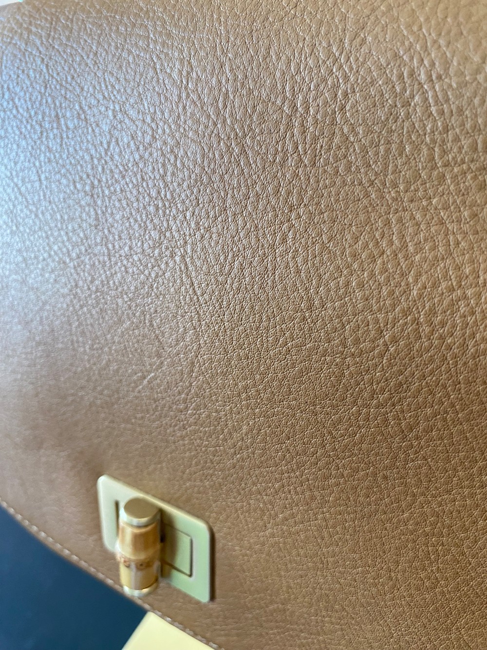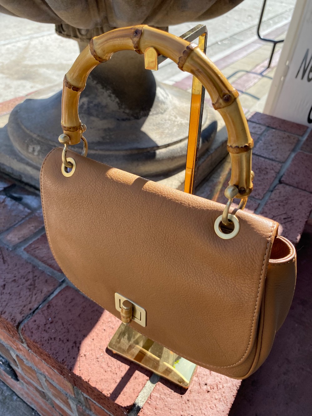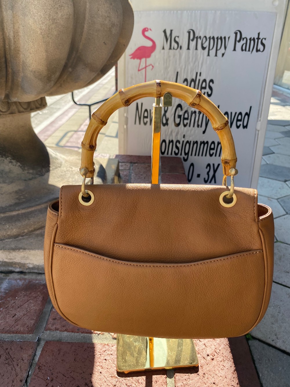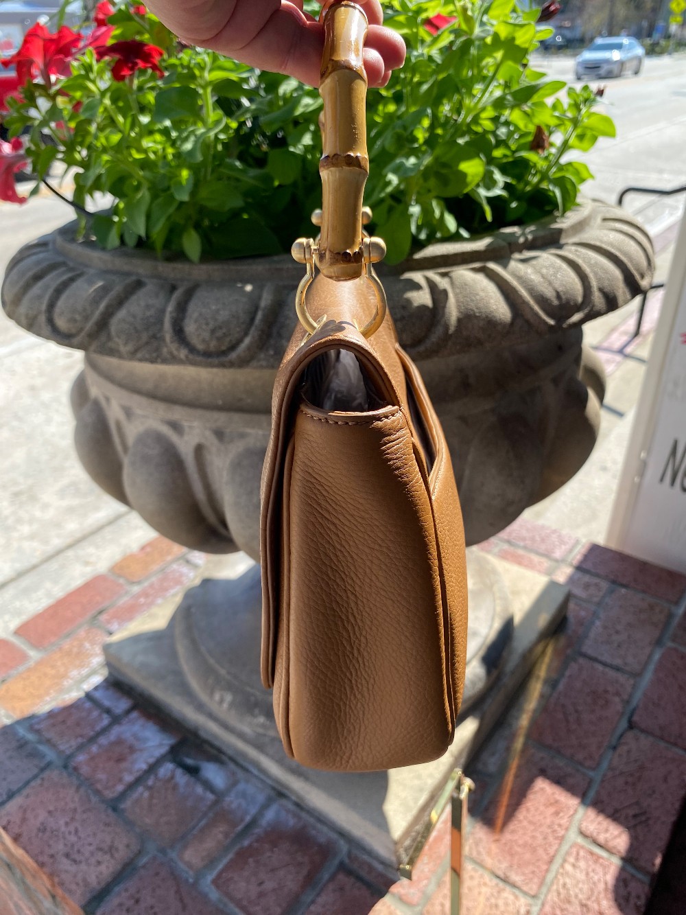 In like new conditionbrown pebbled leatherbamboo handlebrushed gold tone hardwareoutside pocket on the back