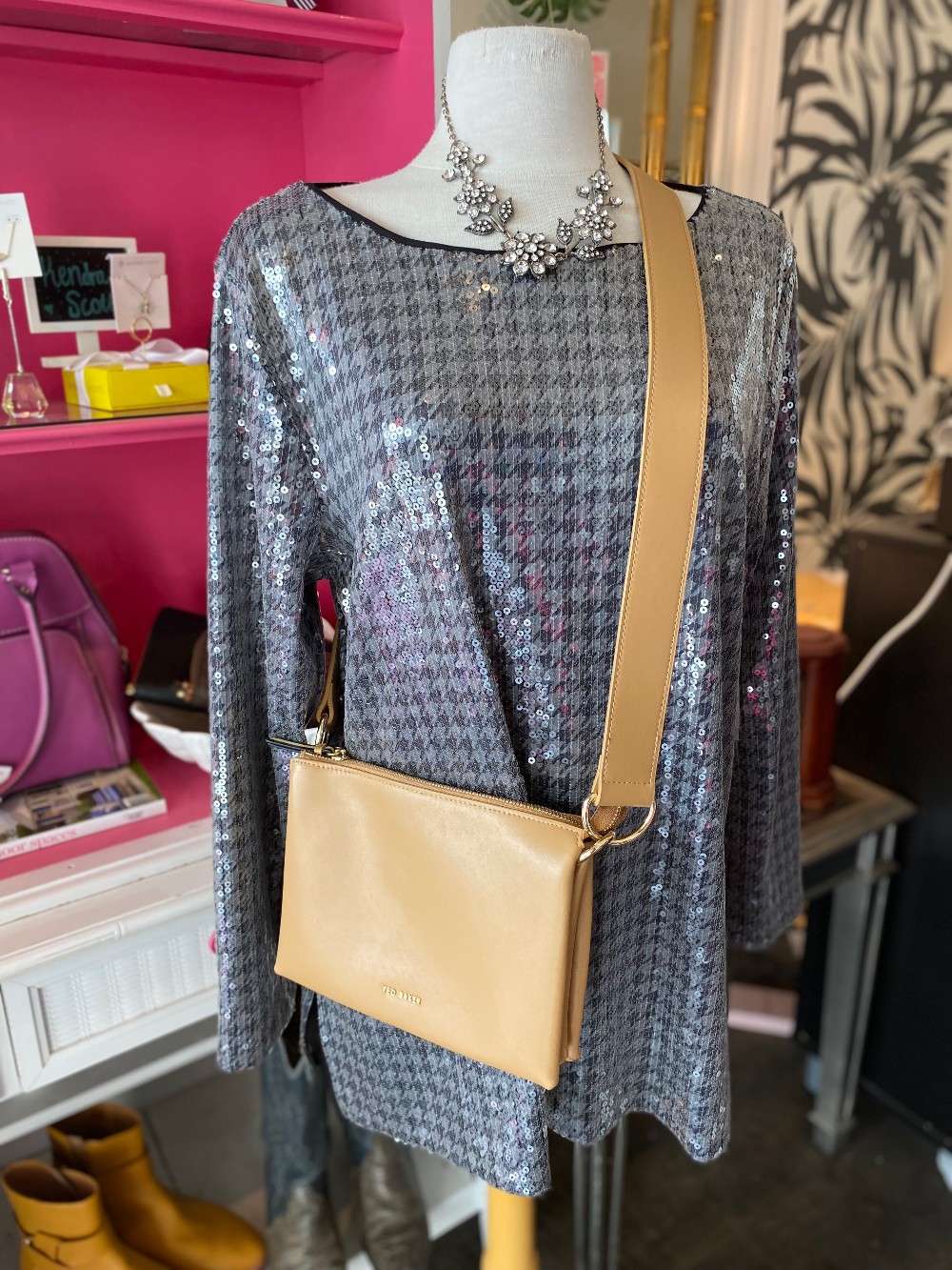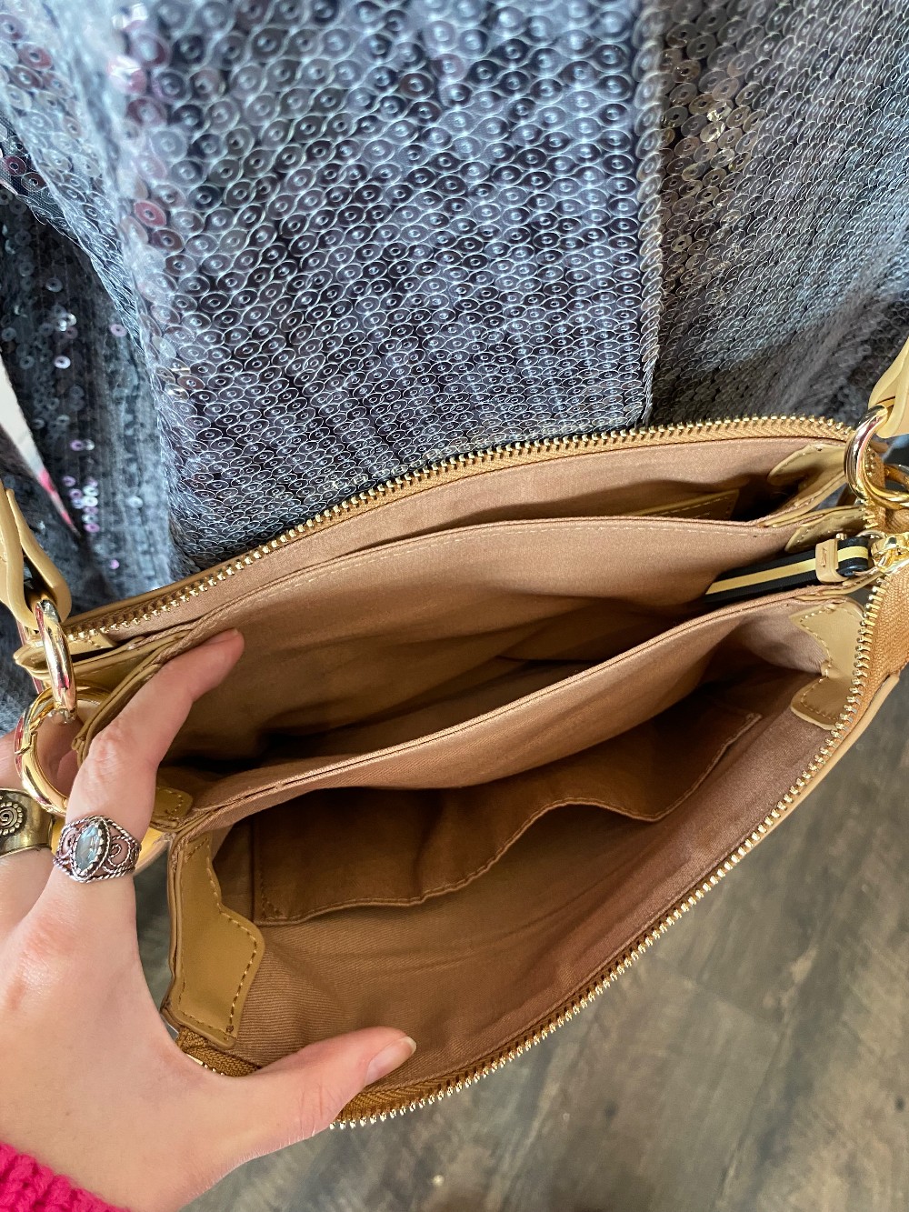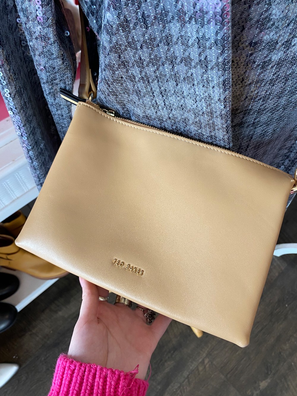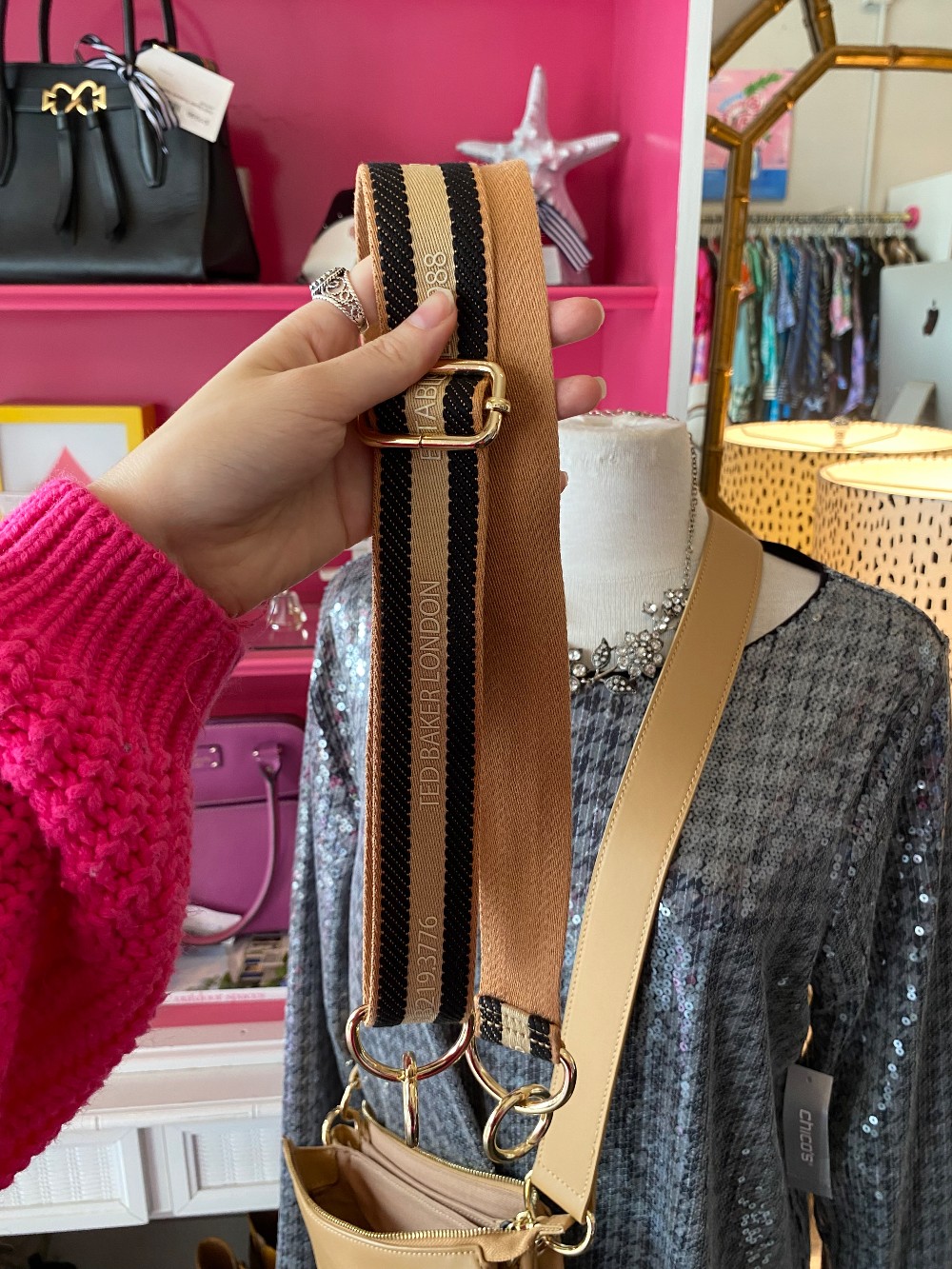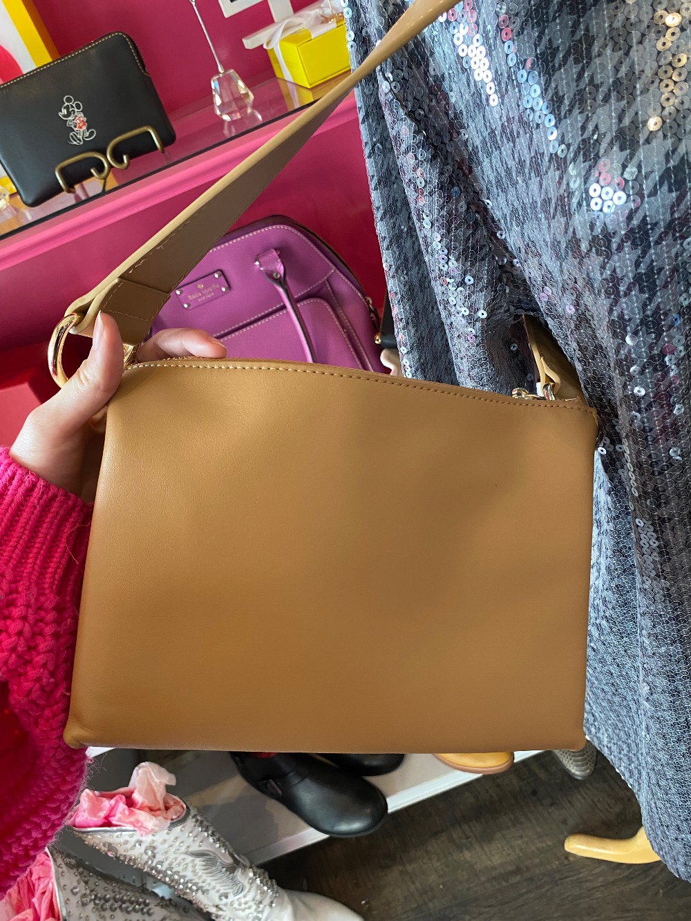 In like new conditionflat tan leather with told tone hardwarecomes with fabric strap and leather strap