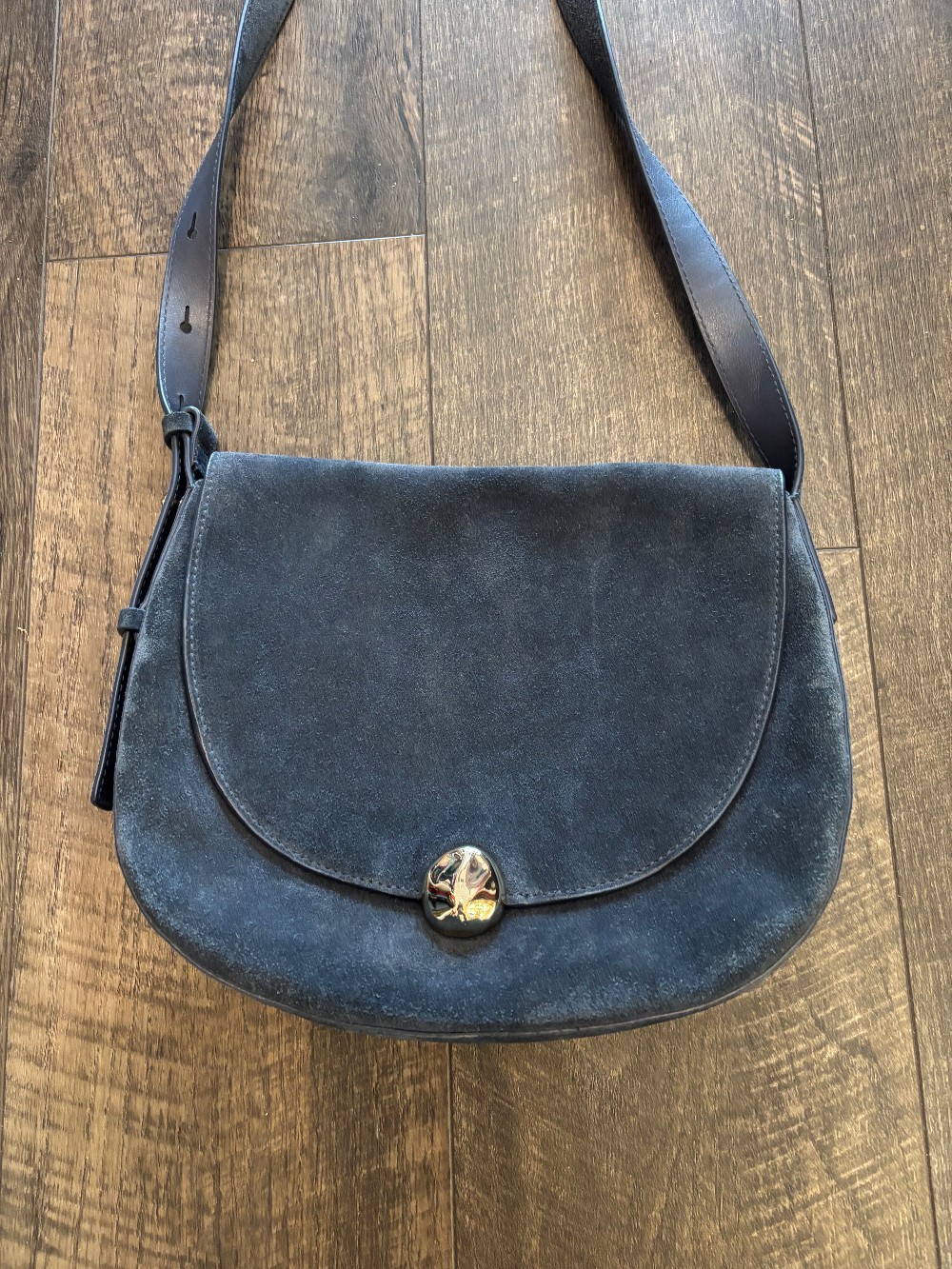 Beautiful navy blue suede crossbodystrap is adjustableflap over with magnetic closuremeasures 11x10