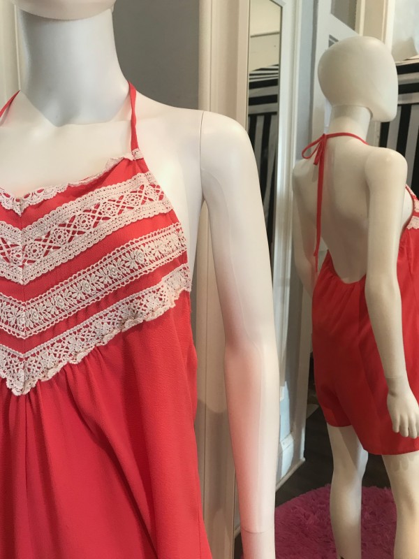 Super sexy for summer. Coral color romper with a low back, made of cotton, ties around the neck.