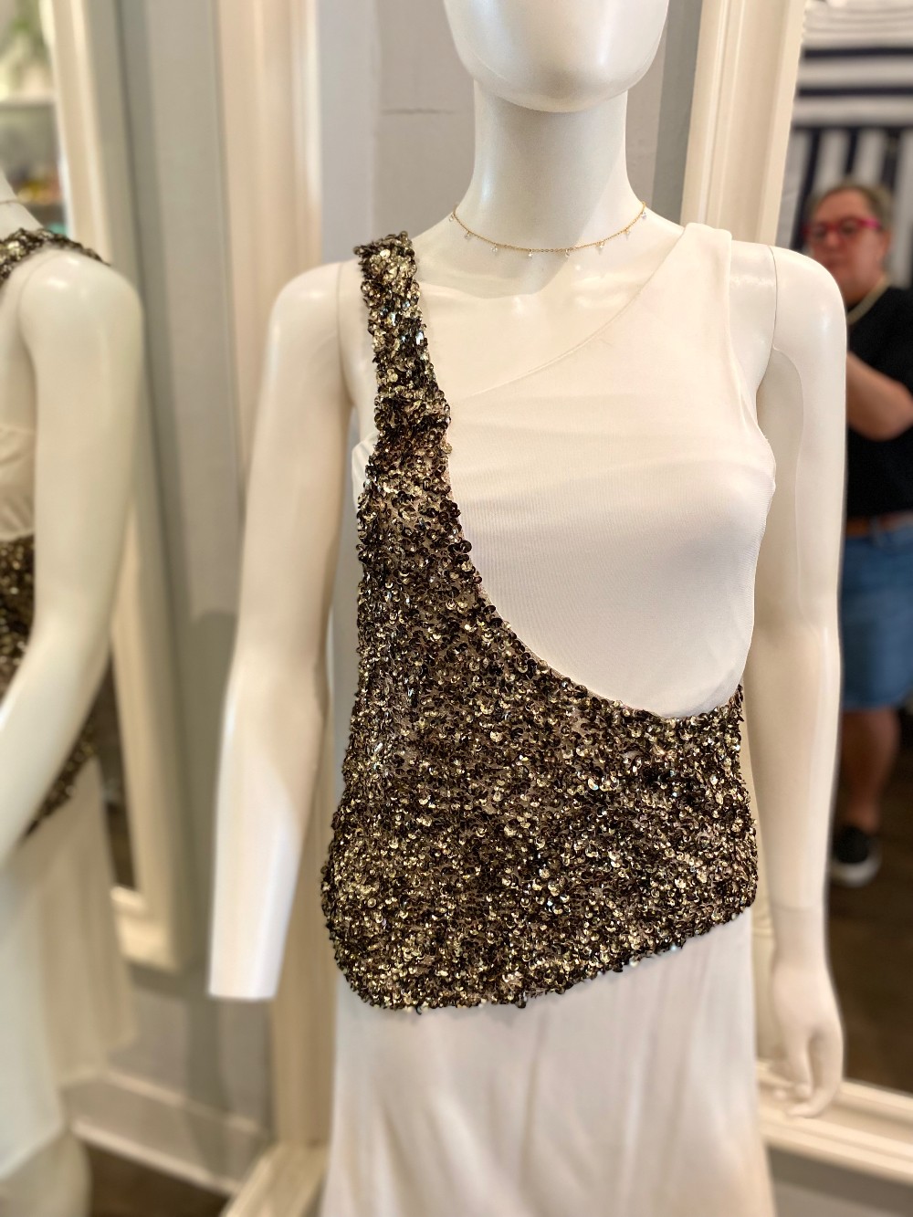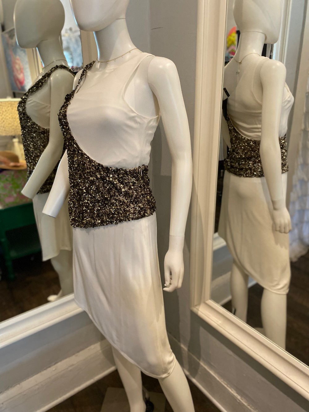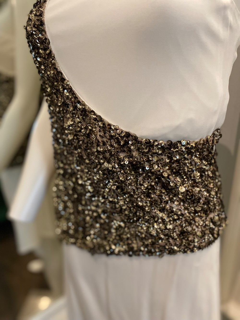 Super unique dressgold sequins over a white dress....interesting.