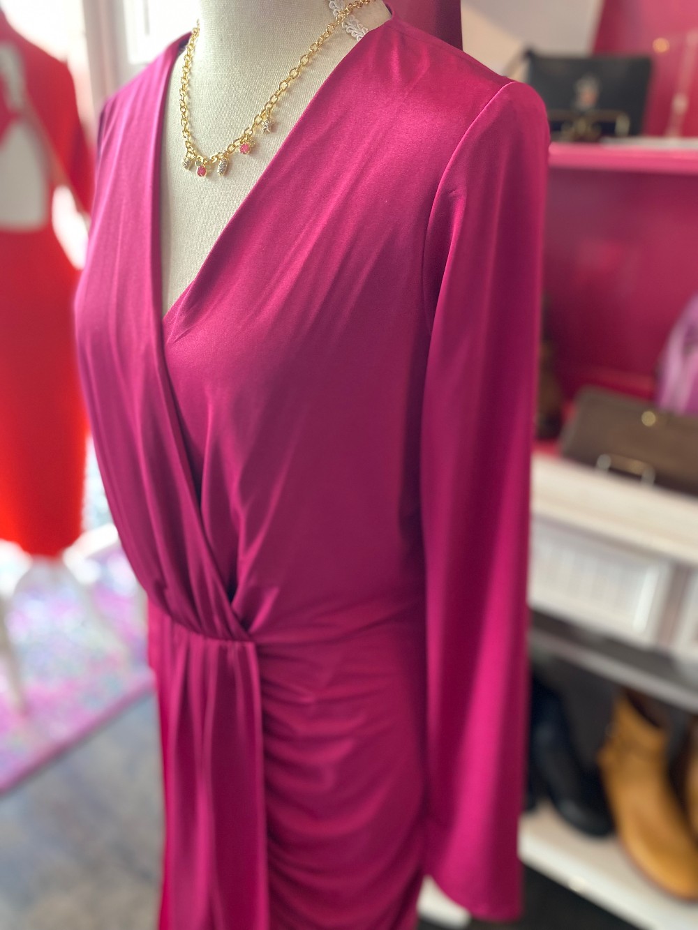 Gorgeous hot pink dress made out of polyester and spandexfully lined