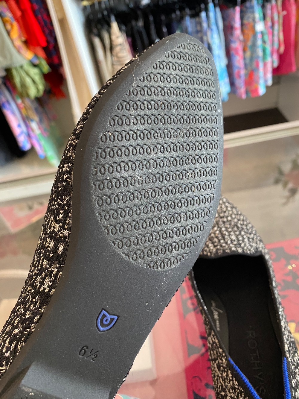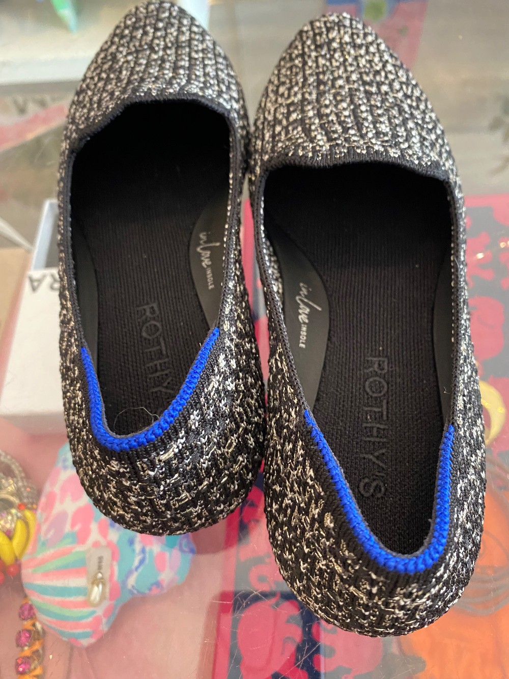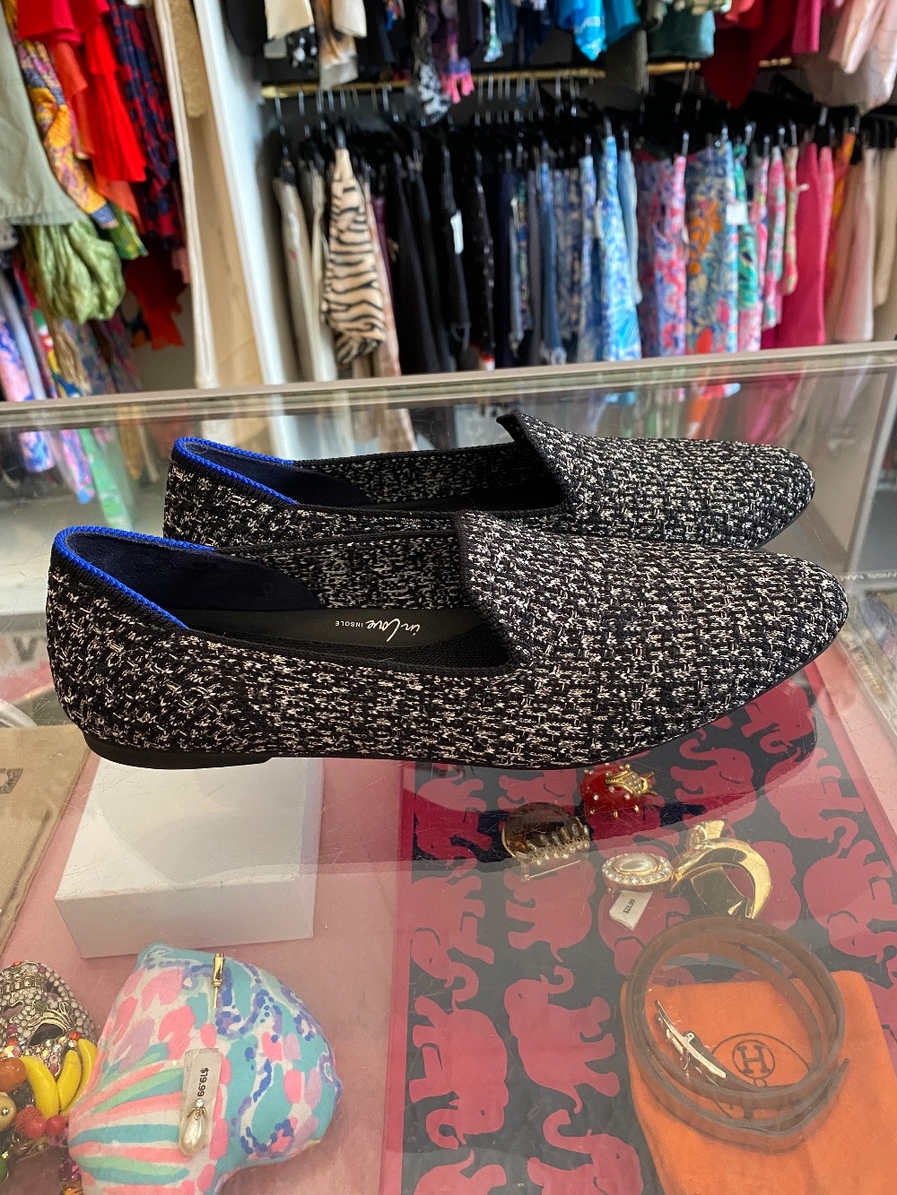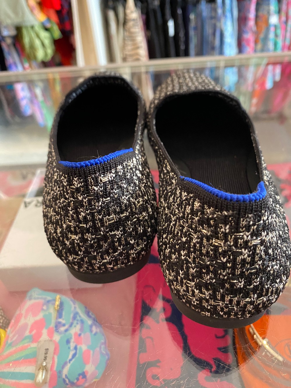 In like new conditionblack and white tweed upper with silver metallic threadrubber sole