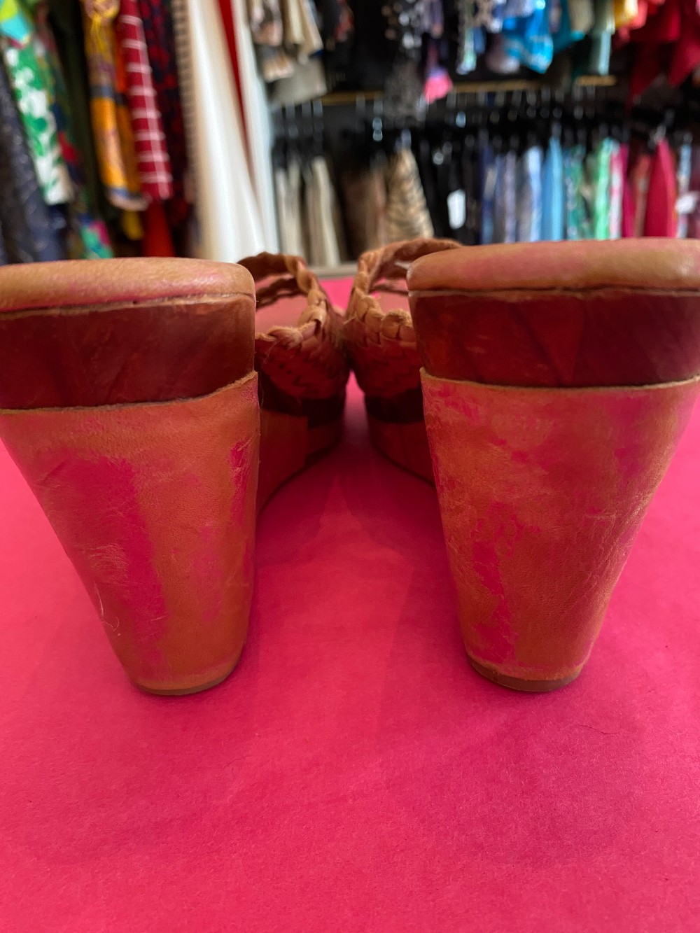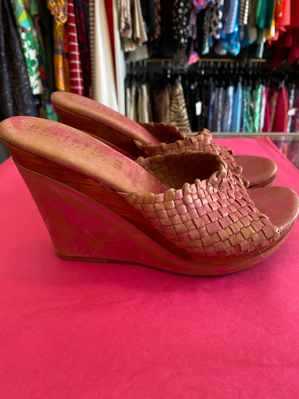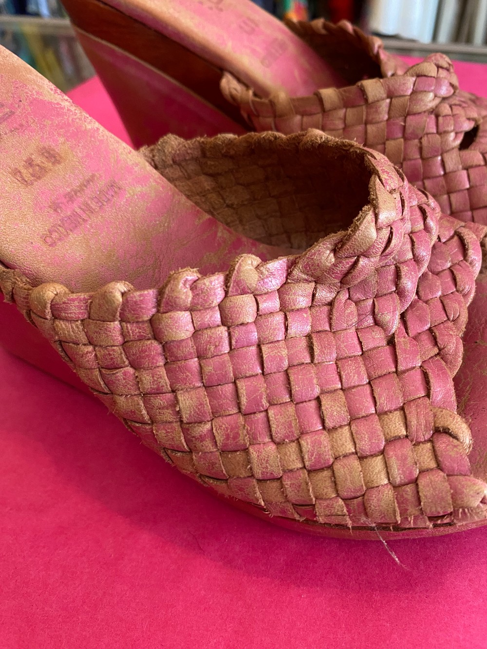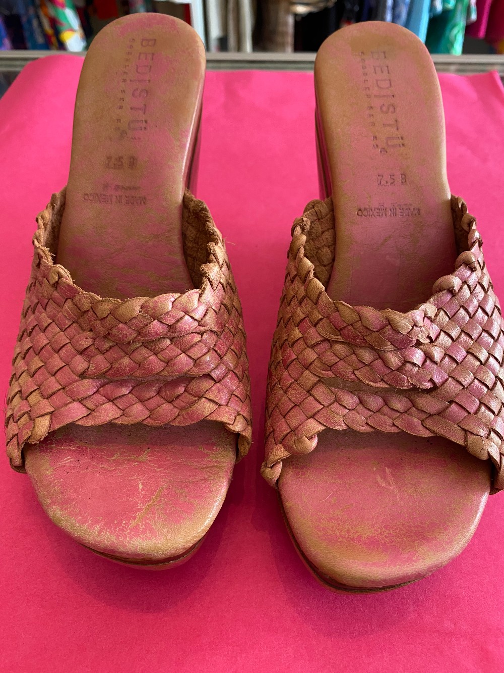 In preloved conditionbed stu woven, wedge sandalspink and tan