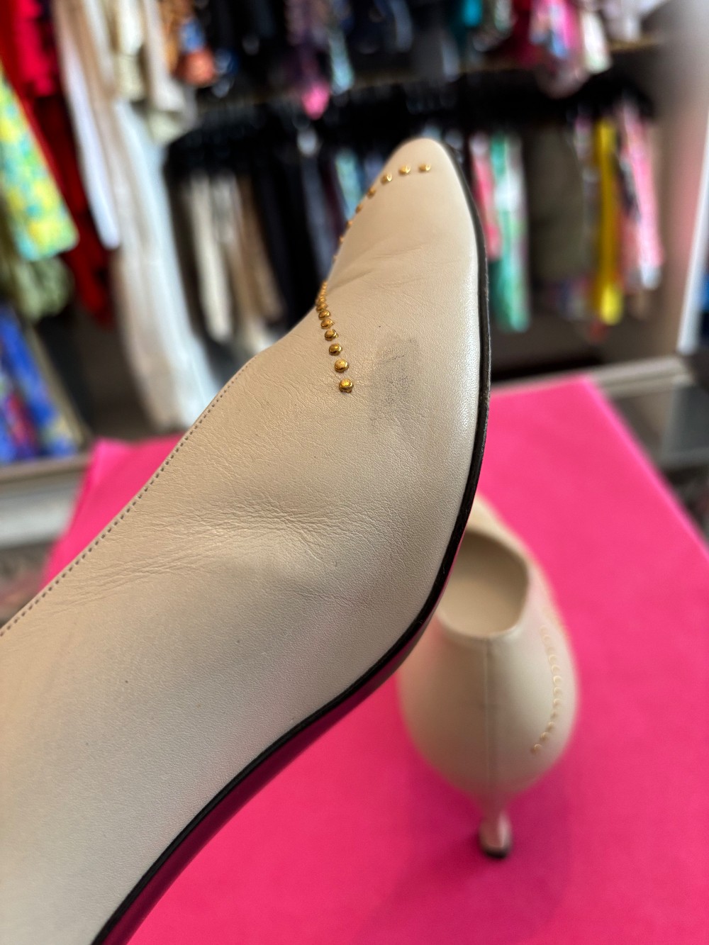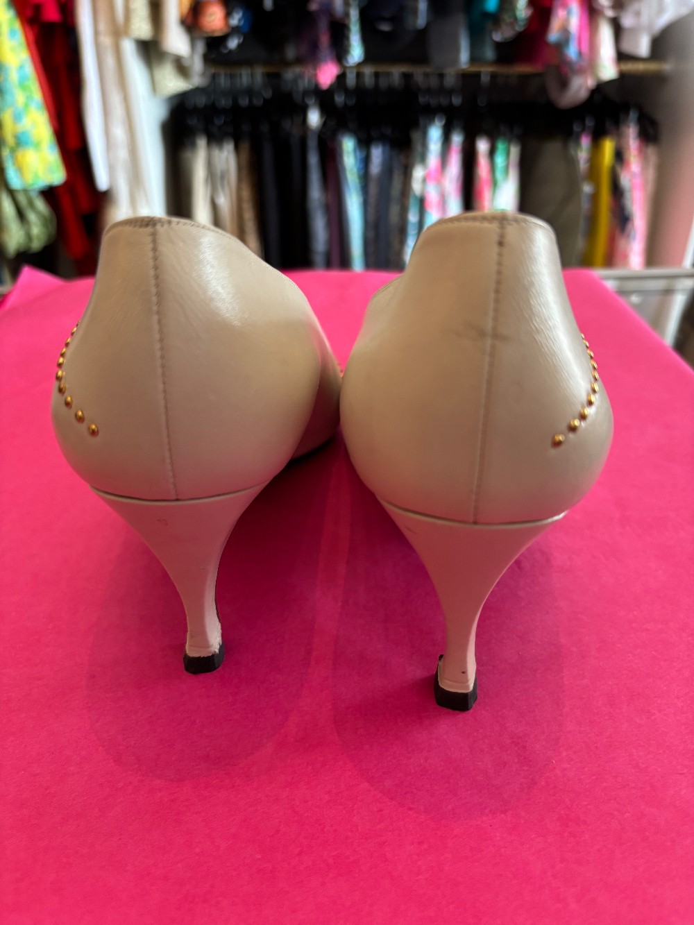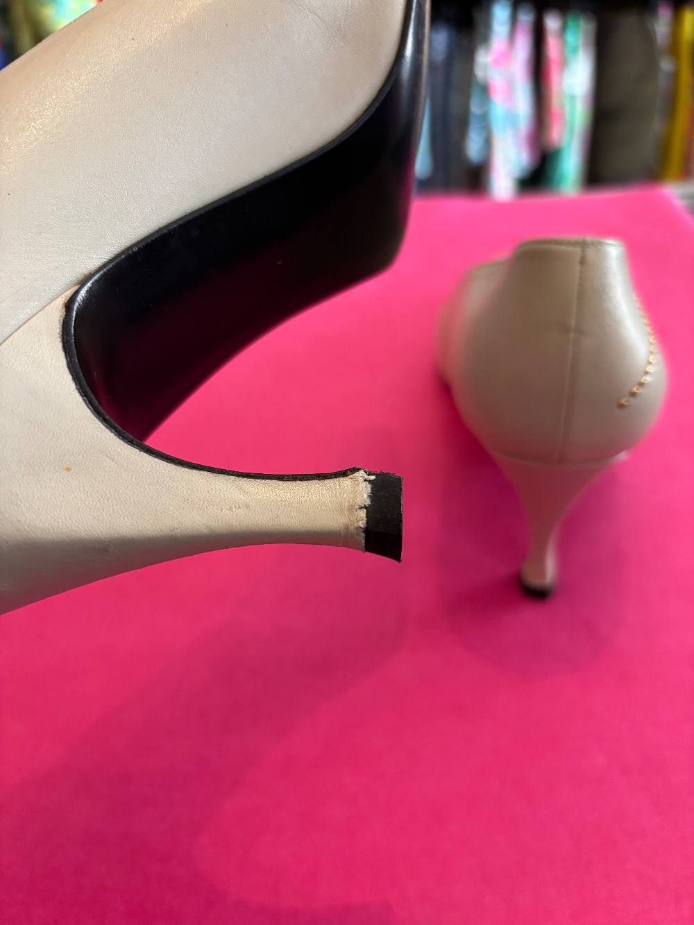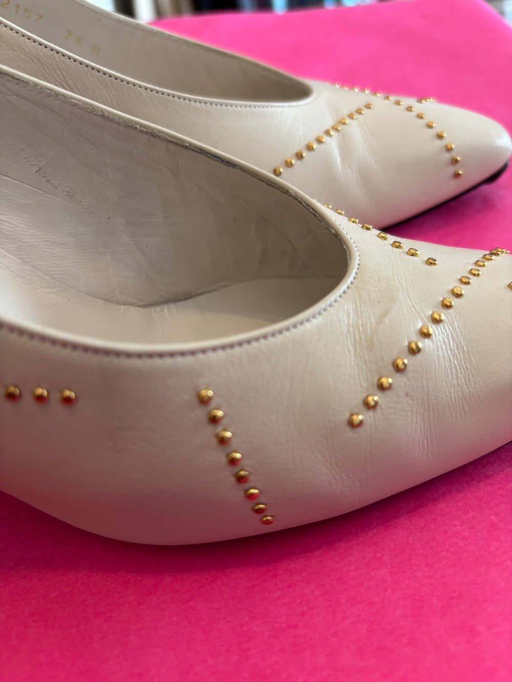 Fun 80's fashionIn vintage condition, minor scuffsbone color leather with gold tone accentsheel is approx 3 inches