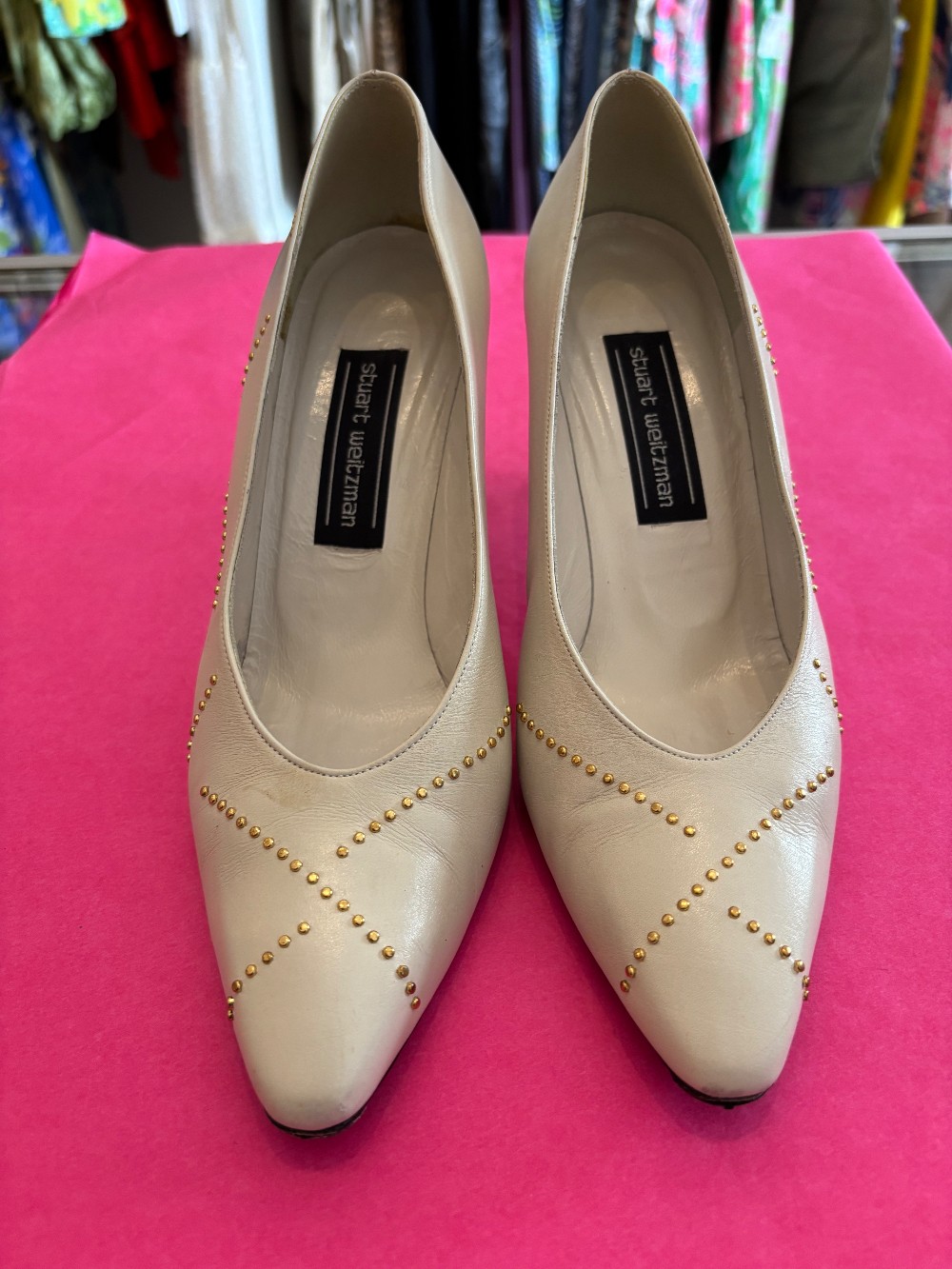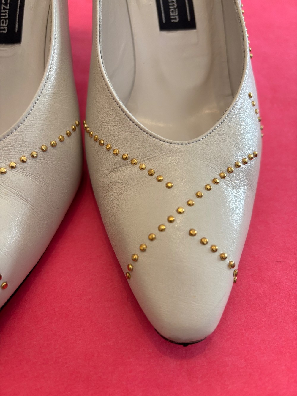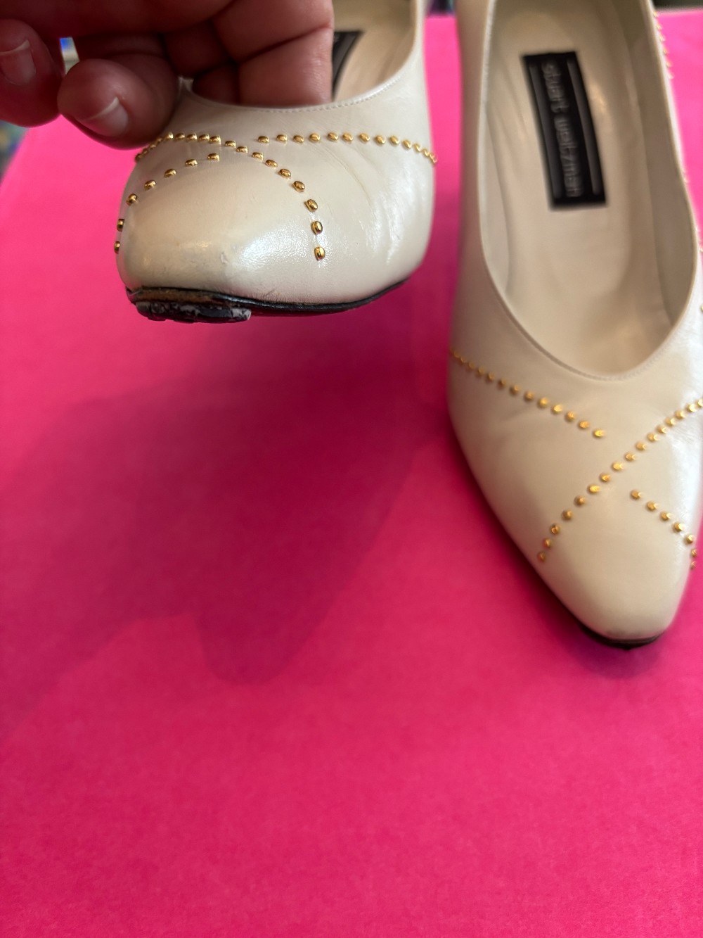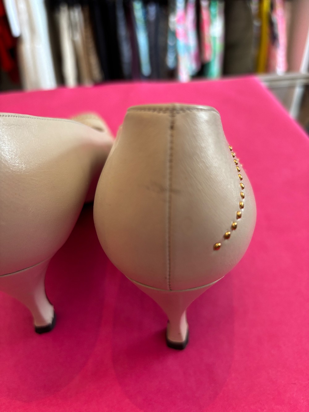Fun 80's fashionIn vintage condition, minor scuffsbone color leather with gold tone accentsheel is approx 3 inches