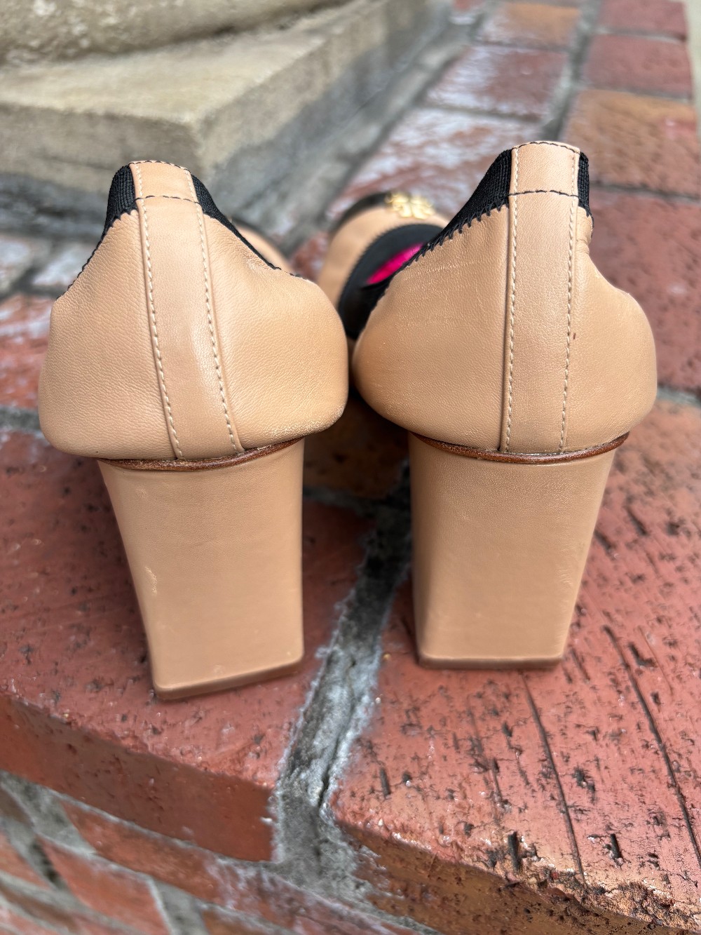 In good preloved conditionminor scuffs on the toeheel is approx 3 inchesgold toneblack and tan