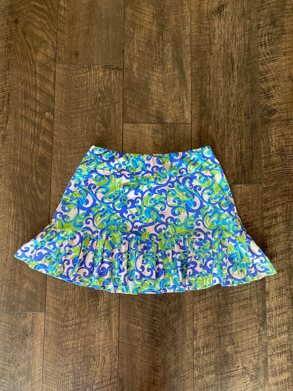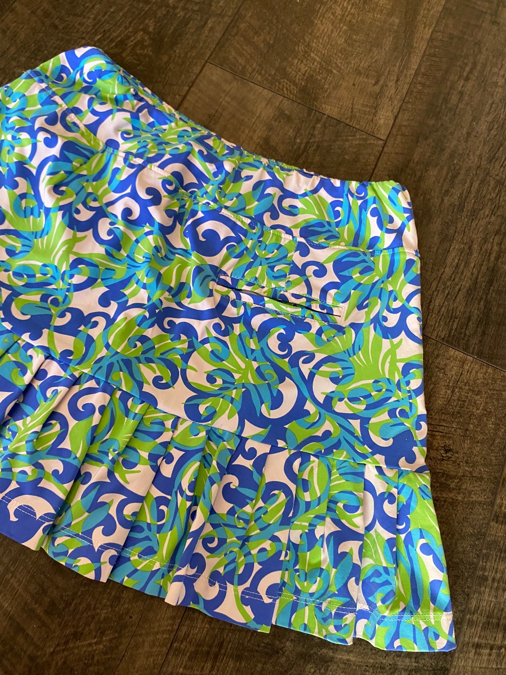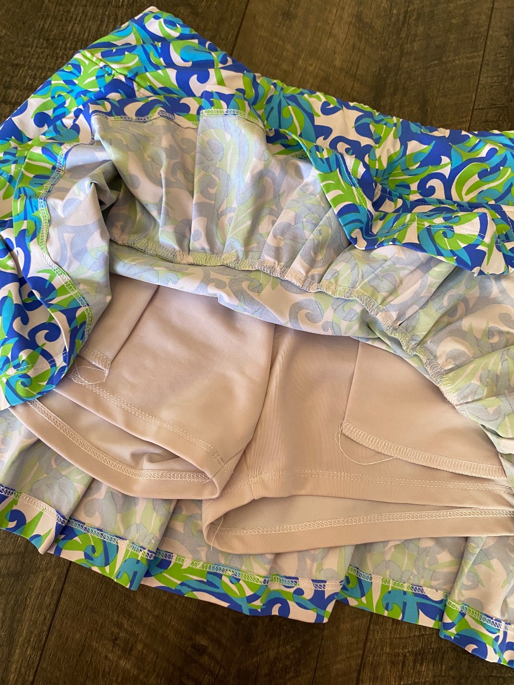 In excellent pre loved condition Made of nylon and spandexPreppy pleated styleHas built in shorts and pockets
