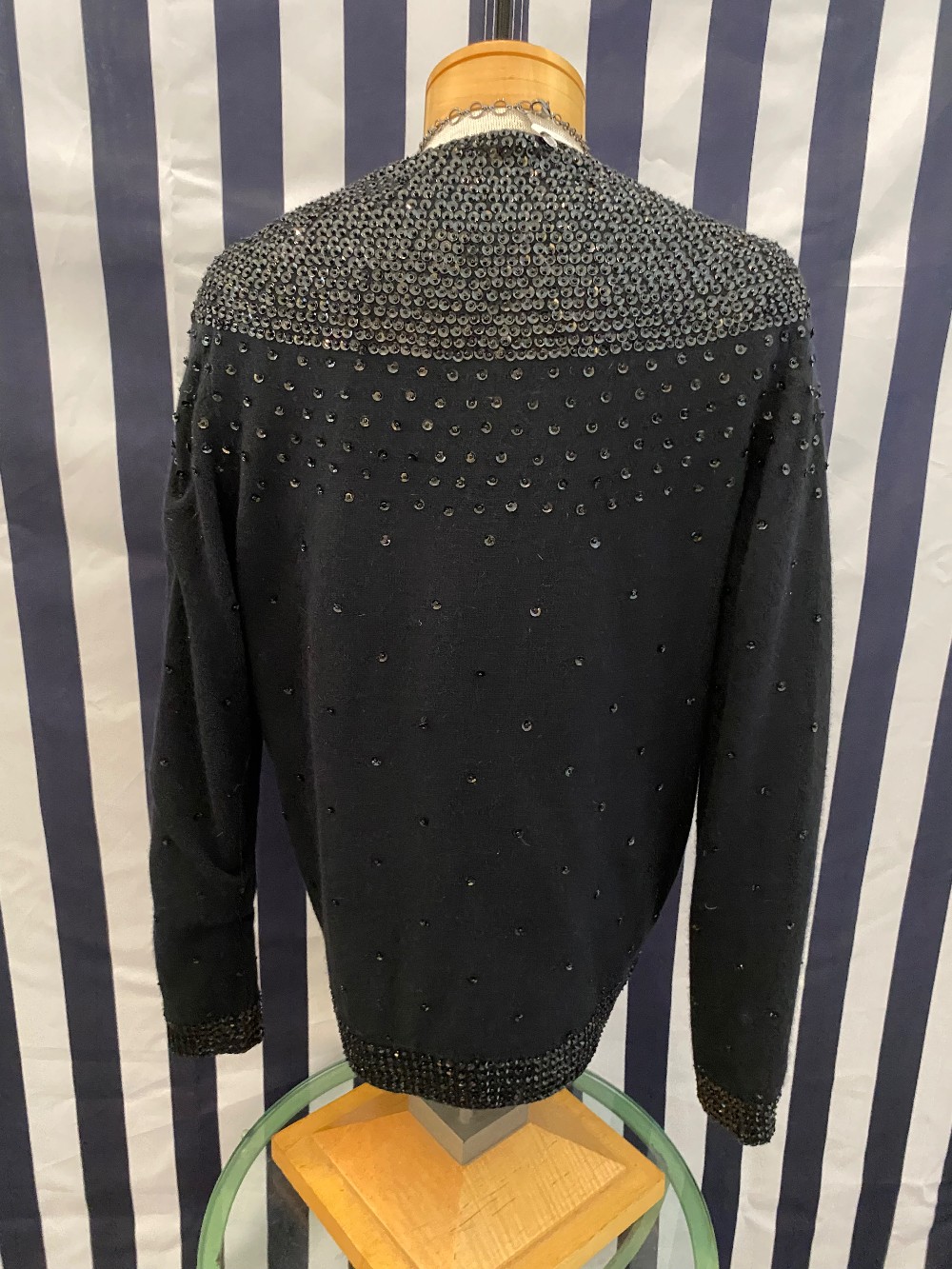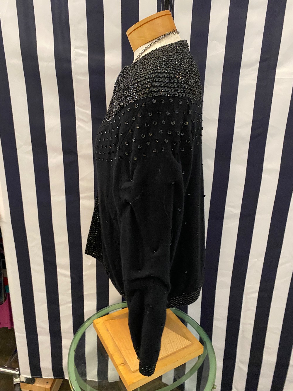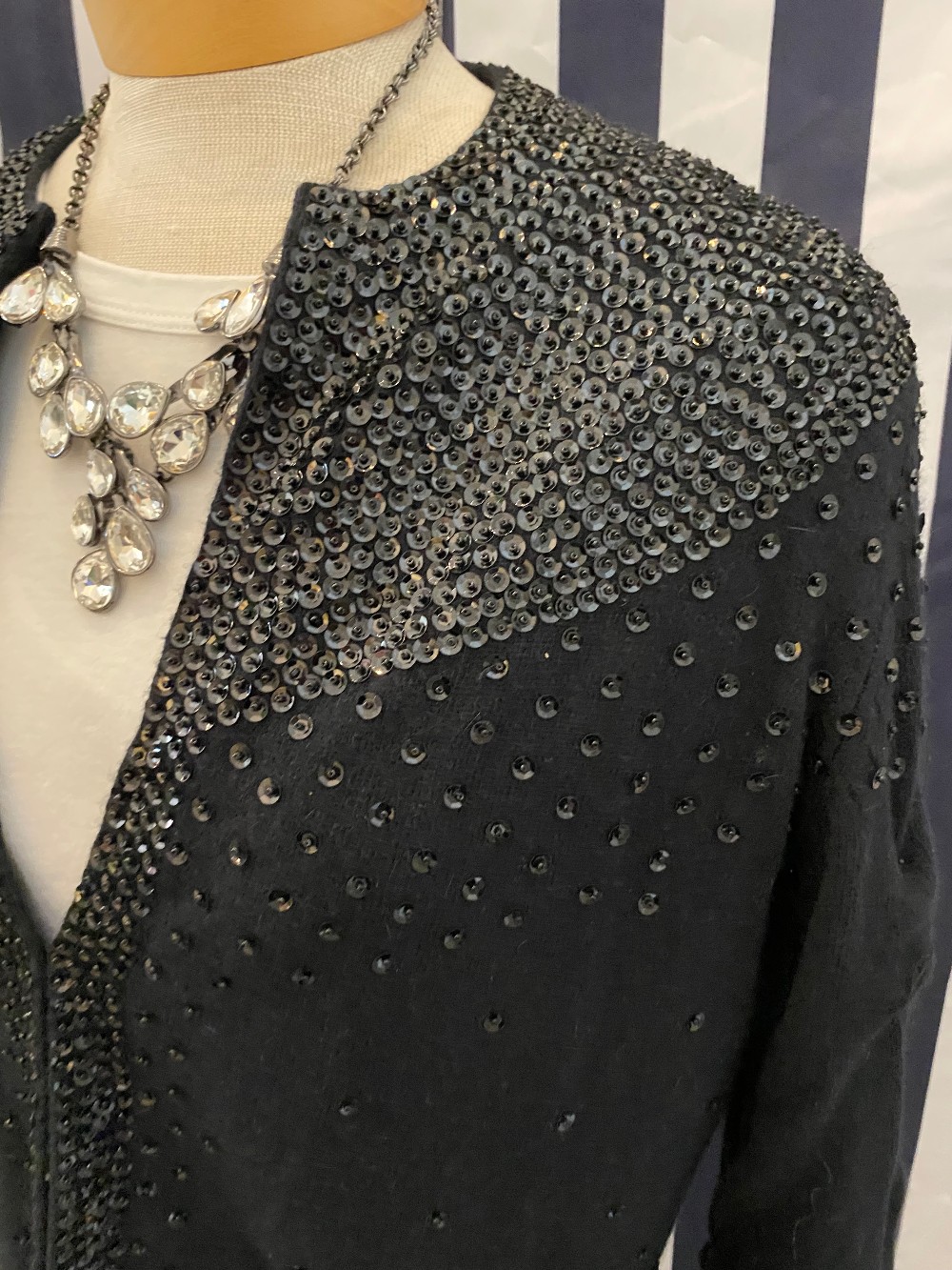 Gorgeous black sequin cardiganno made of tag, but it feels like cashmerehook closure up the front