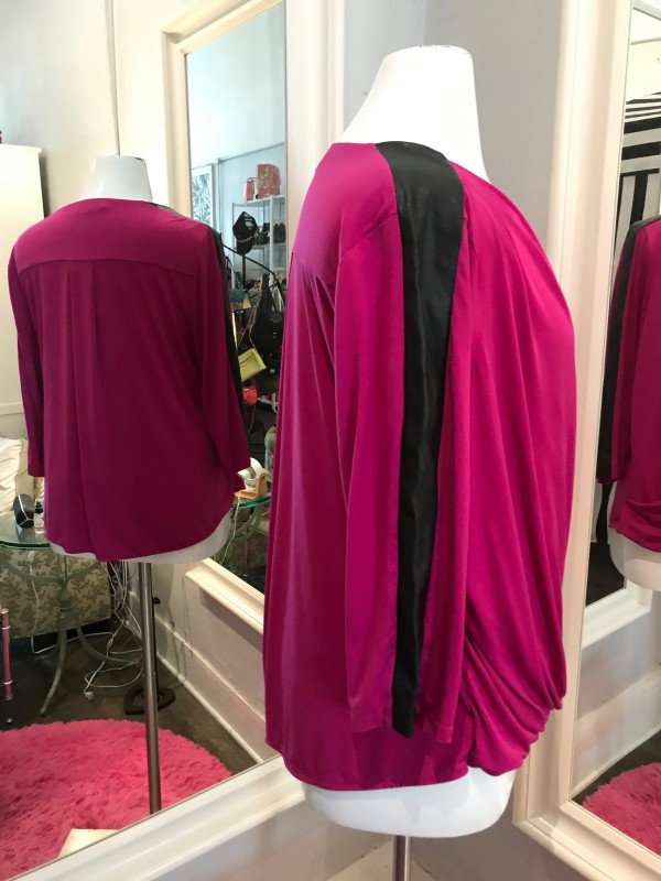 Gorgeous magenta top with faux leather accents down the sleeves. Made of polyester and spandex.