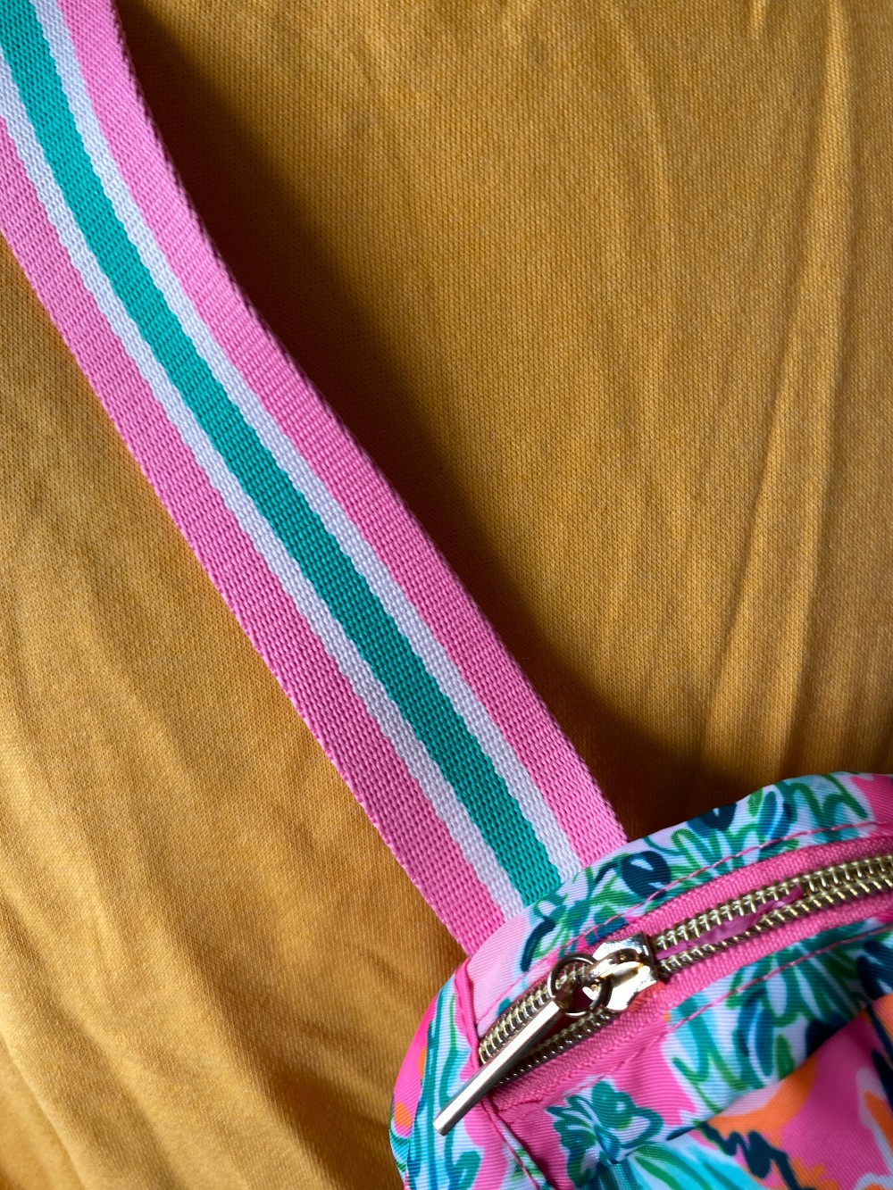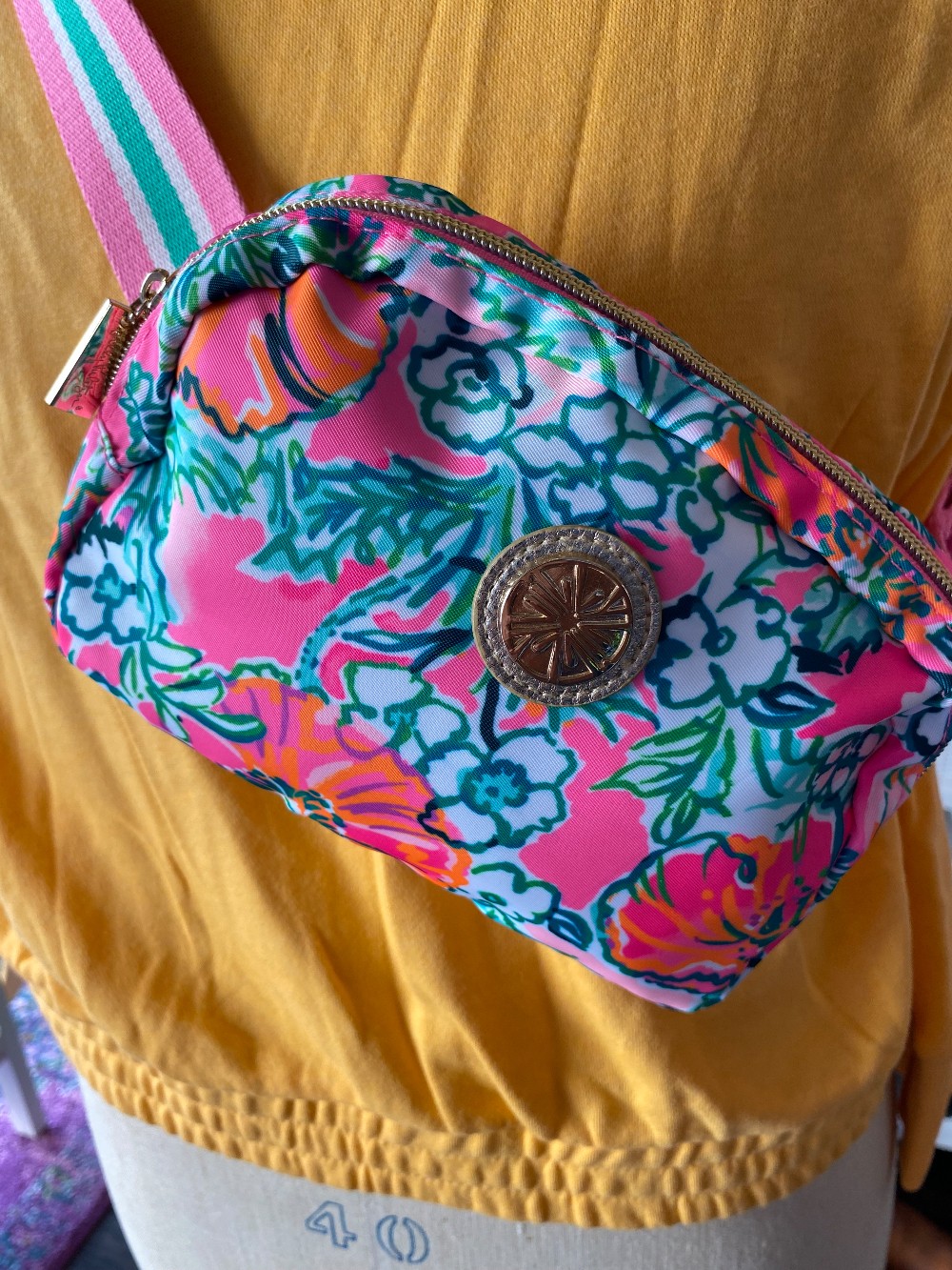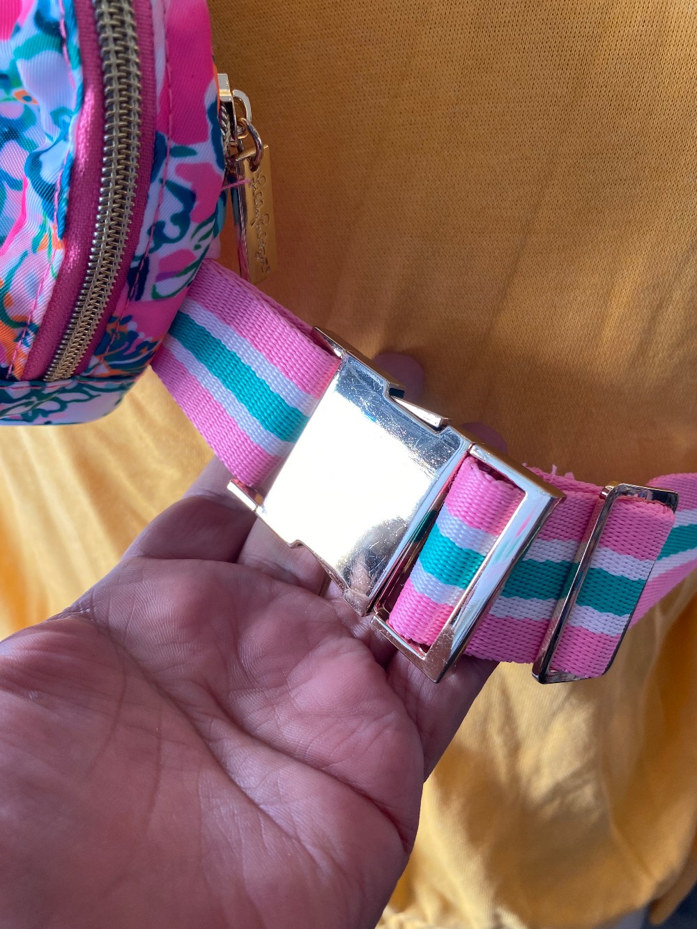 In like new conditionfabric bag with fabric belt and gold tone buckle